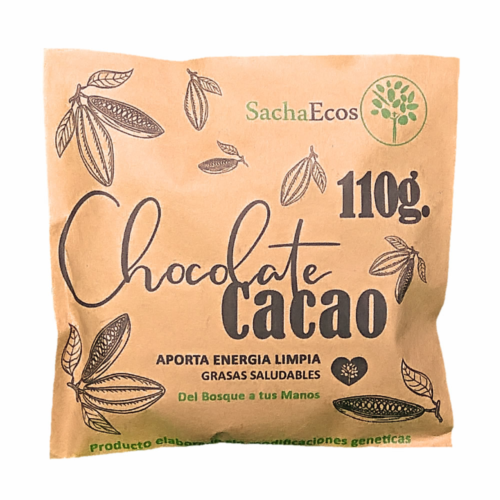 Disfruta del CacaoChocolate de SACHAECOS, 100% puro de semillas de cacao provenientes de áreas agroforestales. Su sabor amargo y mantecoso, de color oscuro, no contiene aceites hidrogenados ni aditivos químicos, ofreciendo un aroma y sabor intensos que deleitan el paladar.